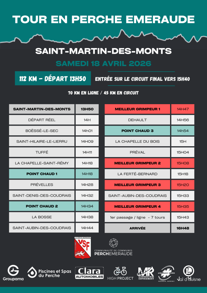 Annulé en 2025 à la demande de la préfecture de la Sarthe en raison des fortes chaleurs, la 14e édition du « Tour en Perche Émeraude », nouveau nom du « Tour de l’Huisne Sarthoise », se tiendra le samedi 18 avril 2026.